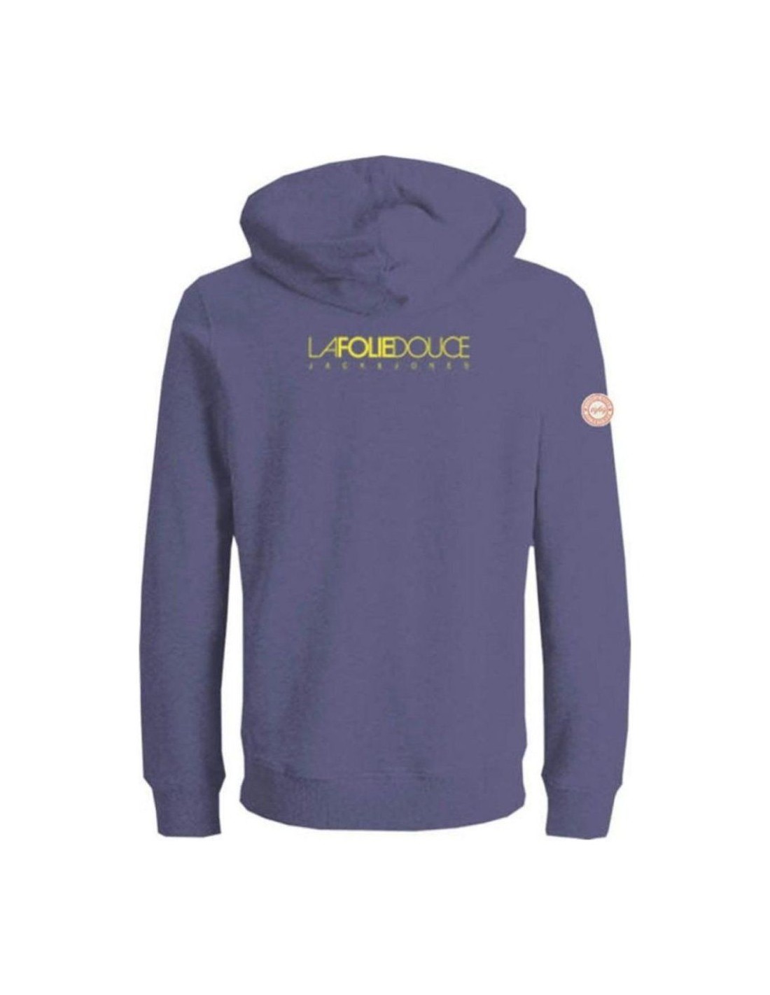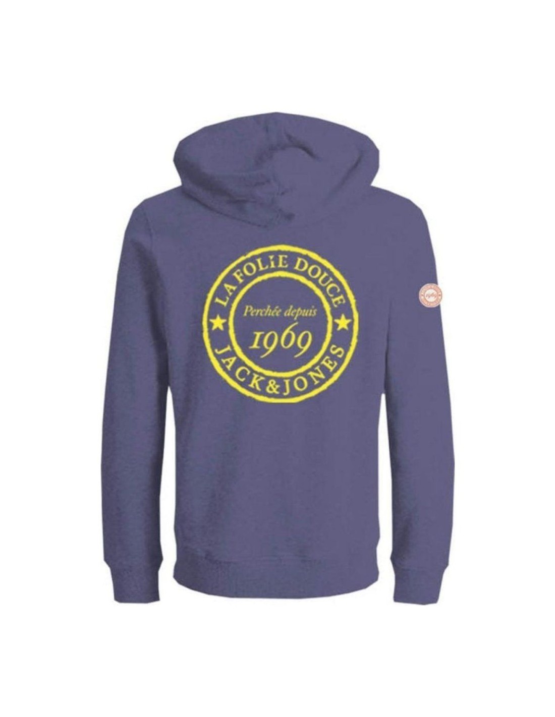 Côté style, la silhouette est droite et décontractée, avec une capuche généreuse et des poignets côtelés pour un maintien optimal. La face avant arbore le logo La Folie Douce x Jack & Jones en lettrage bicolore jaune et doré, tandis que le dos dévoile un grand motif circulaire emblématique orné de la mention « Perchée depuis 1969 », véritable signature de l'univers La Folie Douce. Un patch tissé discret orne l'épaule gauche, ajoutant une touche collector à l'ensemble.