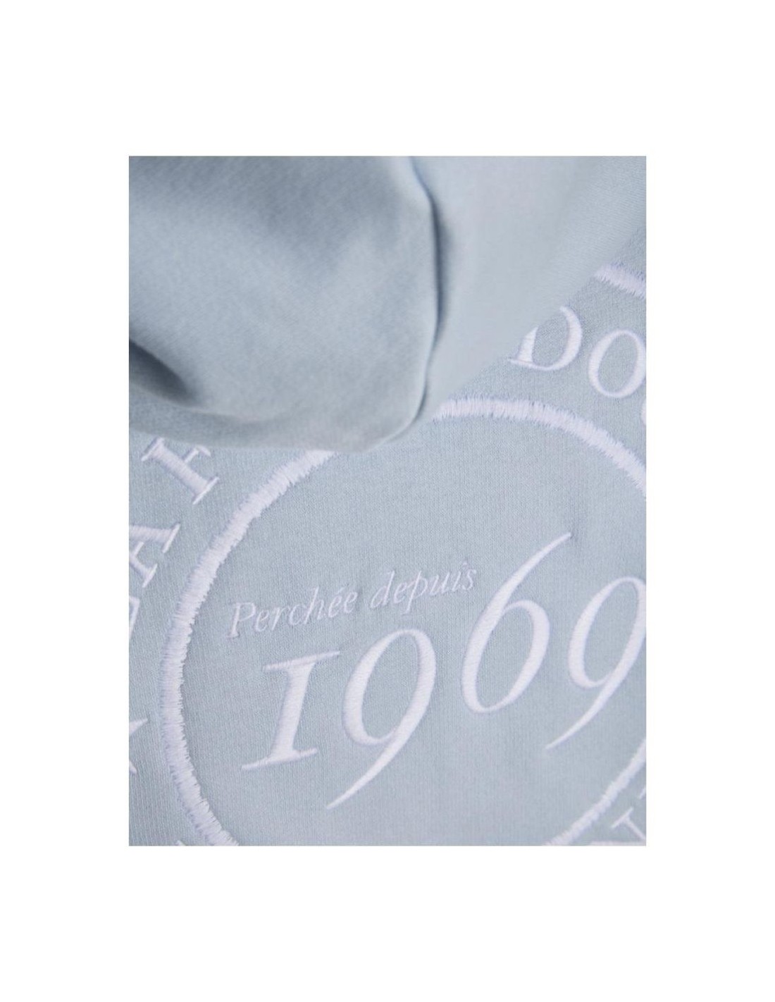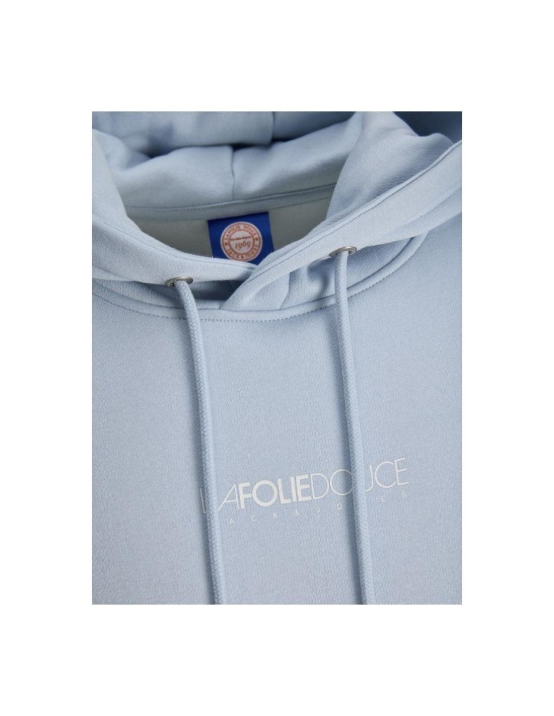 La coupe est ample et déstructurée, pour une silhouette relax assumée. À l'avant, un discret logo La Folie Douce imprimé en ton sur ton apporte une touche de sobriété, tandis que le dos révèle un emblème circulaire brodé mêlant l'inscription « Perchée depuis 1969 » et la signature Jack&Jones — un détail artisanal soigné qui fait toute la différence. La capuche généreuse avec cordon de serrage, la poche kangourou avant et les bords-côtes aux manches et à l'ourlet assurent une finition impeccable et un maintien confortable.
